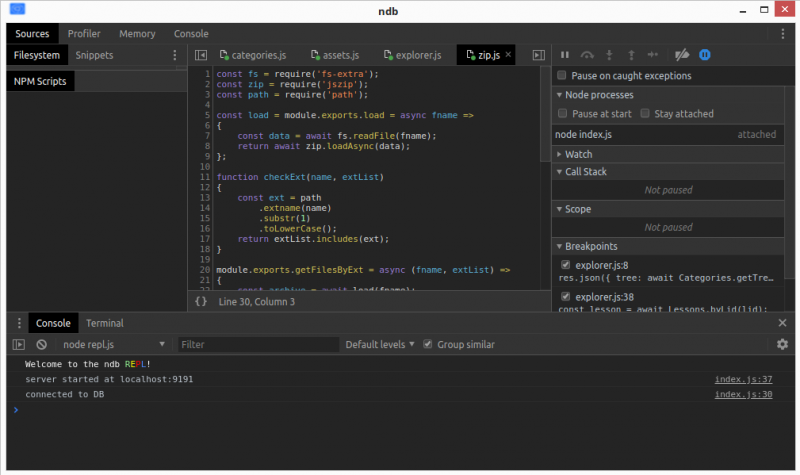 Пост-заметка об ndb. Всем кто пишет для nodejs периодически приходится отлаживать своё приложение. Да даже тем, кто использует mocha или webpack бывает нет-нет да удобнее отладить по-человечески проблему, нежели тыкать повсюду console.log-и. NodeJS издавна предоставляет нам для этого браузерный инструмент.