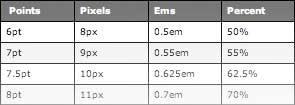 Наткнулся на полезнейшую вещь - таблицу соответствий единиц измерений шрифта (pt, px, em, %). На всякий случай скопипастил на сайт, для долговечности :) (источник).