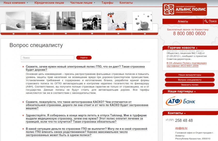 Альянс Полис (alp.kz) — казахстанская страховая компания. Сайт содержит новости, раздел «вопрос-ответ», обширную информацию об оказываемых услугах, тарифы и пр. публикации. При помощи специальных калькуляторов можно подсчитать стоимость 4-х видов (ГПО, каско, имущество, для туриста) страхования. Также есть возможность заказать полис онлайн.