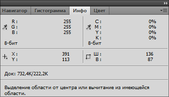 При вёрстке сложных (и не очень) дизайнов очень важно точно определять и соблюдать размеры любых графических элементов. Для подобных вещей в Photoshop предусмотрено окно\панель "Информация" (Info). Оно показывает: