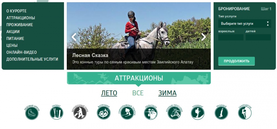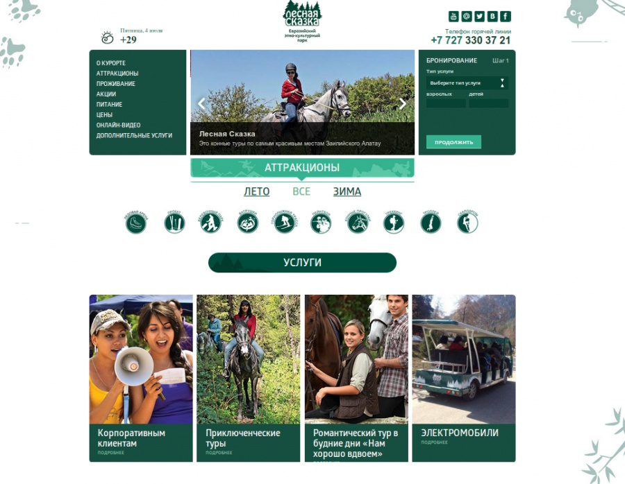 За довольно сжатые сроки был создан сайт для евразийского этно-культурного парка «Лесная сказка». Комплекс довольно крупный, включает в себя большое кол-во аттракционов (тут вам и горнолыжная трасса, и пейнтбол, и троллей, и конные прогулки и многое другое), коттеджей, ресторанов…